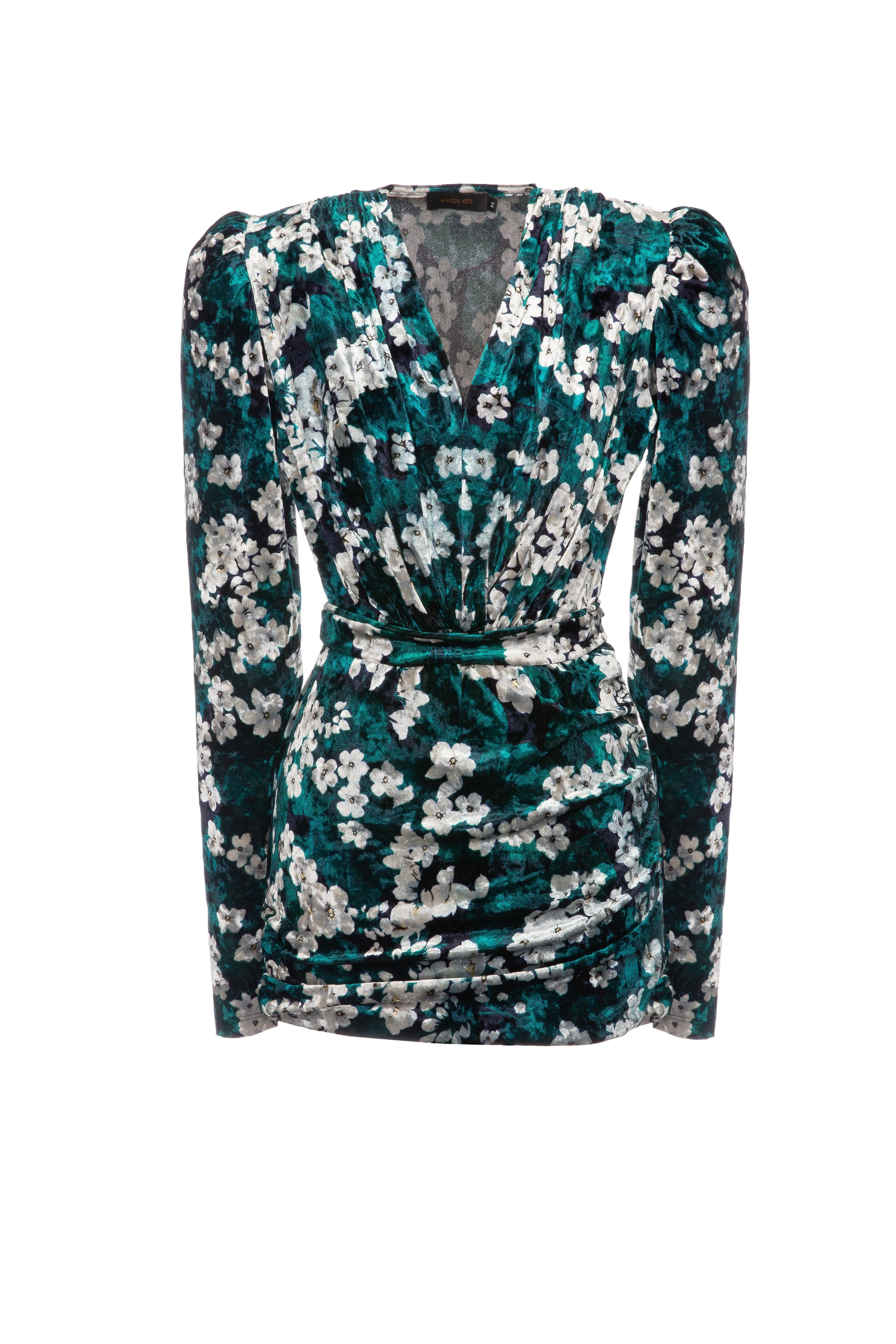 An exquisite velvet green dress that embodies elegance and sophistication. Andorned with white floral patterns, it offers a unique touch of lightness and charm. The fitted silhouette, deep V-neckline, and draped details enhance the feminine figure with graceful allure.