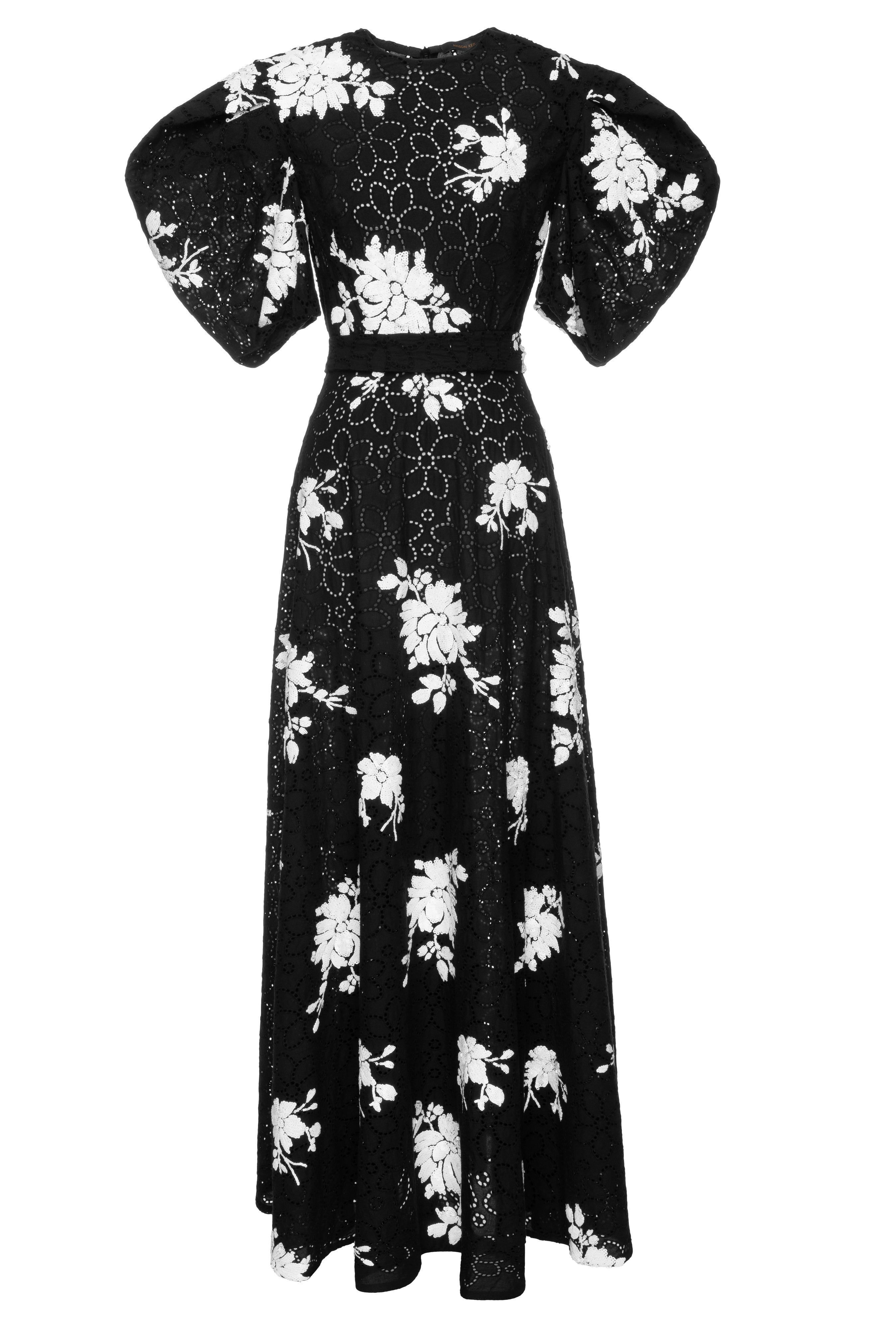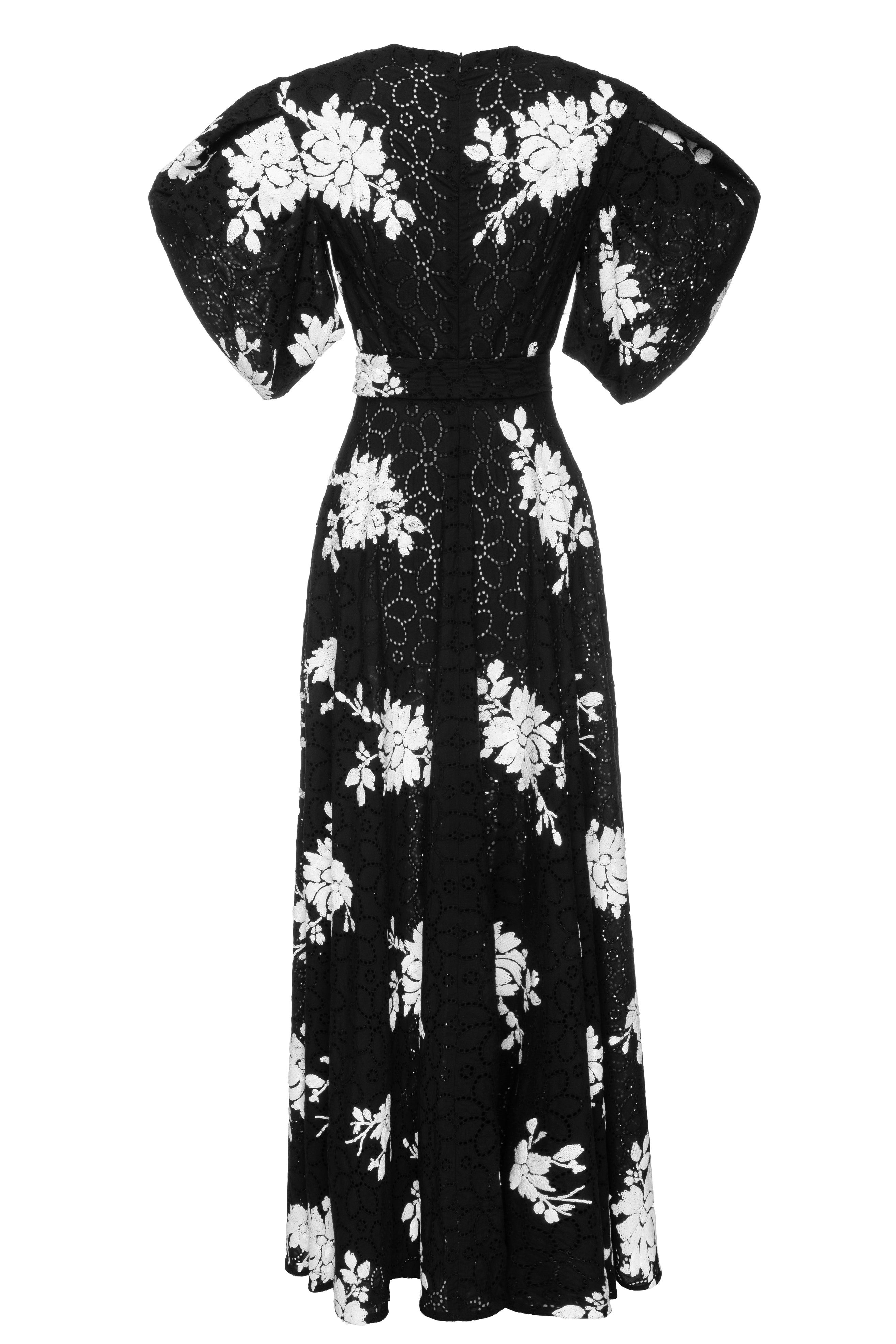 This black cotton dress, adorned with oversized white floral accents, brings refined monochrome harmony to life. Its relaxed silhouette with bold, short sleeves beautifully blends simplicity with modern flair. The striking contrast of colors highlights the natural motifs, giving the dress a unique and elegant touch. Perfect for summer days.