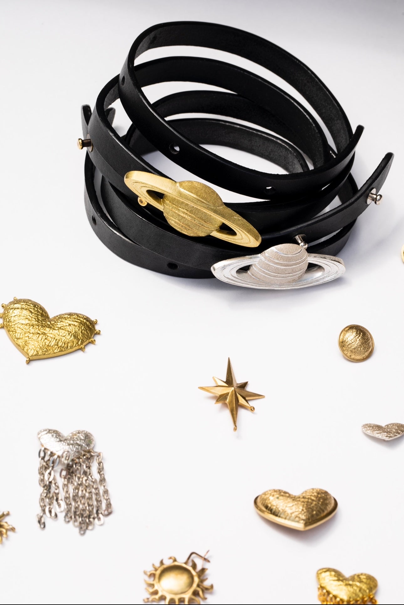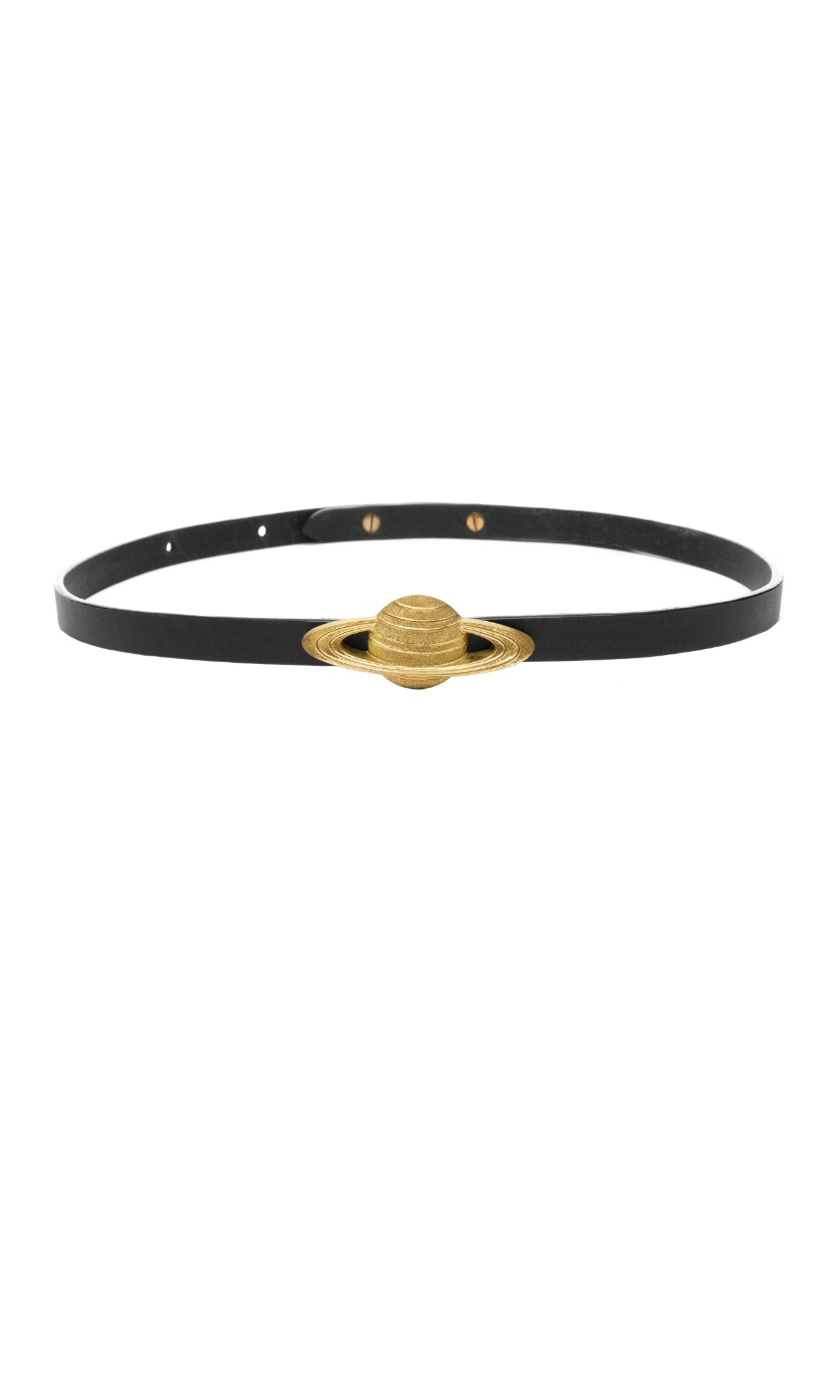 This refined black leather belt is a luxurious finishing touch to any look, featuring a delicate golden planet to provide an elegant hint of femininity. Crafted from the highest quality smooth leather, this item carries a touch of modern sophistication. Elegant and timeless, this belt is sure to be a favorite.