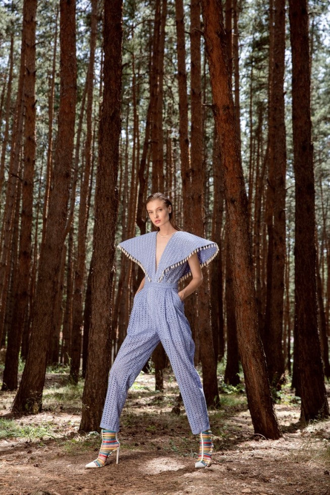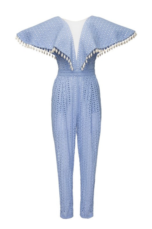 A light blue cotton jumpsuit with a large collar adorned with hanging pearls. The soft cotton fabric offers comfort and breathability, while the oversized collar gives a touch of elegance and uniqueness. The addition of pearls hanging delicately from the collar adds a luxurious and refined detail, making the piece suitable for both casual and semi-formal occasions.