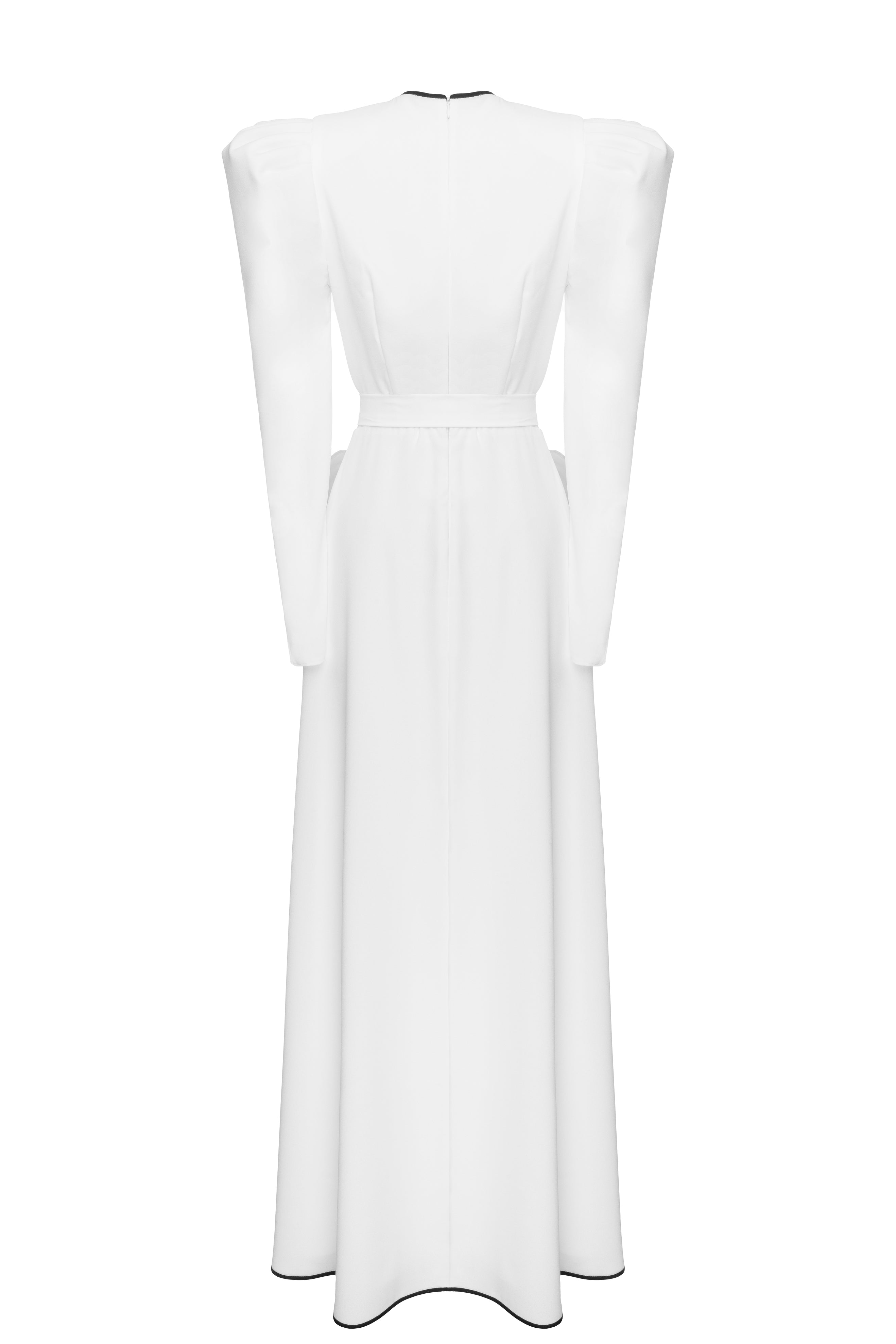 This white georgette dress is a perfect fusion of delicacy and contrast. The elegantly cut heart-shaped neckline radiates femininity, outlined by a bold black trim that creates striking contours. The highlight of the design lies in two large decorative roses, adding a subtle yet impactful touch. The airy georgette fabric enhances the dress’s lightness, making it an ideal choice for a romantic evening.