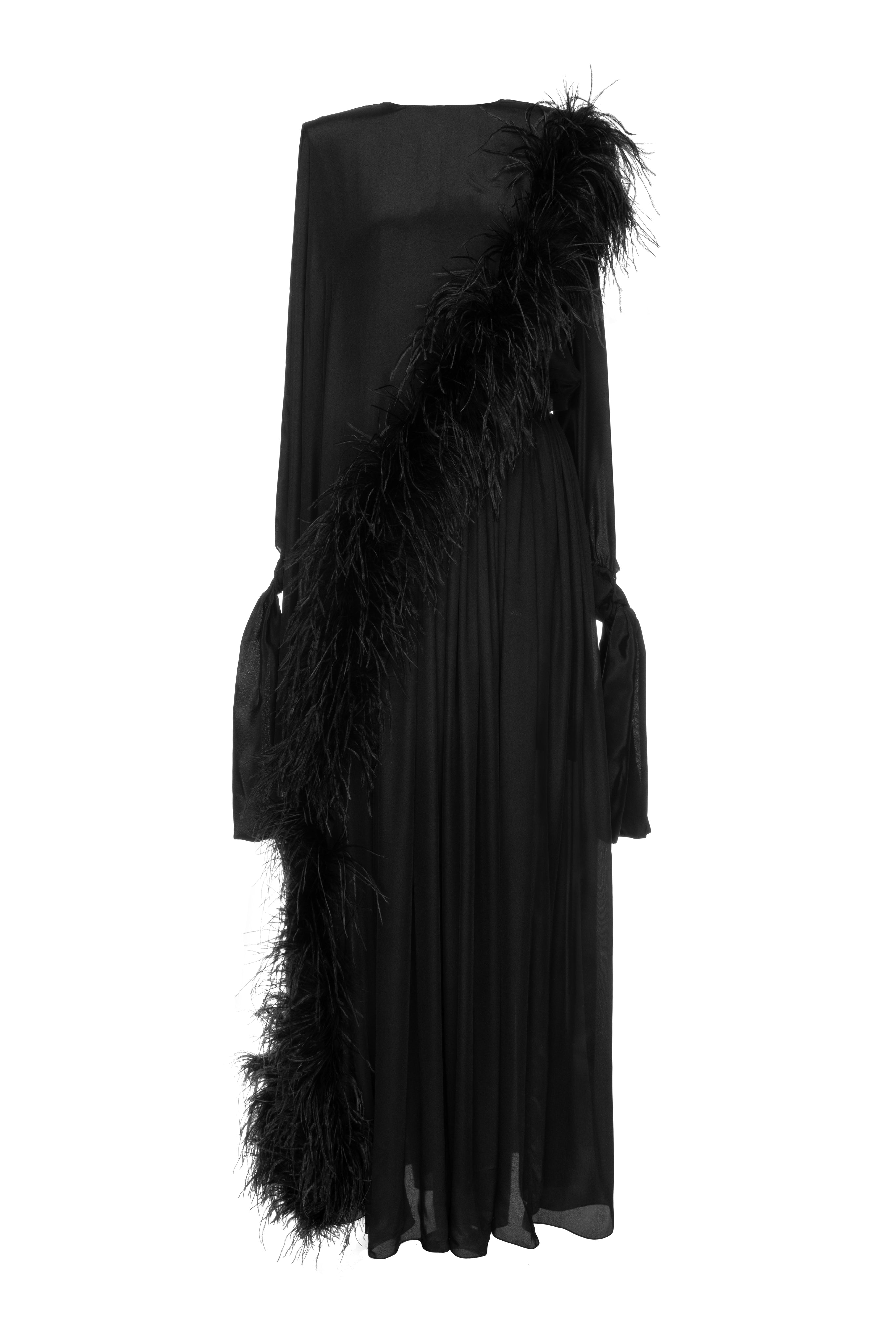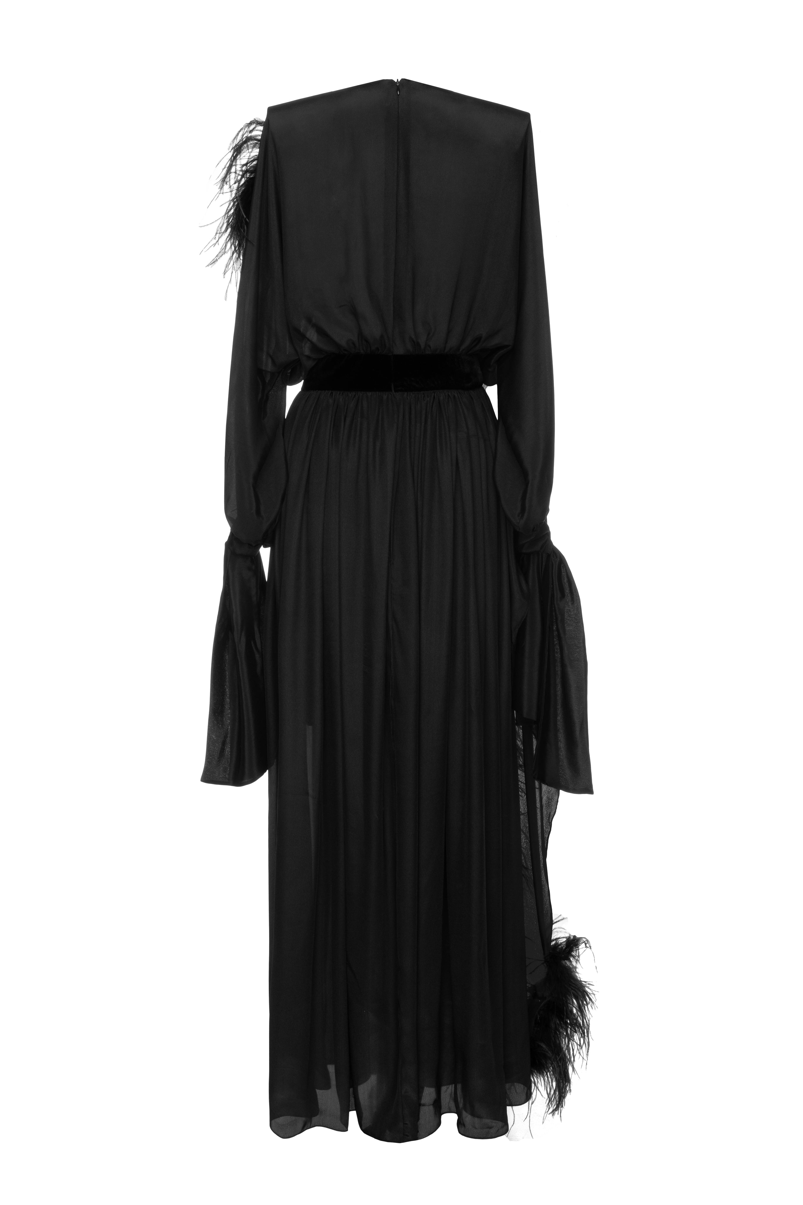 This black silk dress is the epitome of sophistication, combining the luxurious texture of silk with playful and dramatic details. The straight silhouette flows smoothly over the body, while the feathered apron adds an unexpected, bold touch to the design. The dress features a delicate bow at the cuffs, enhancing its feminine appeal. The cinched waist, highlighted by a coquettish detail at the waistline, adds a subtle yet flattering shape to the overall look.