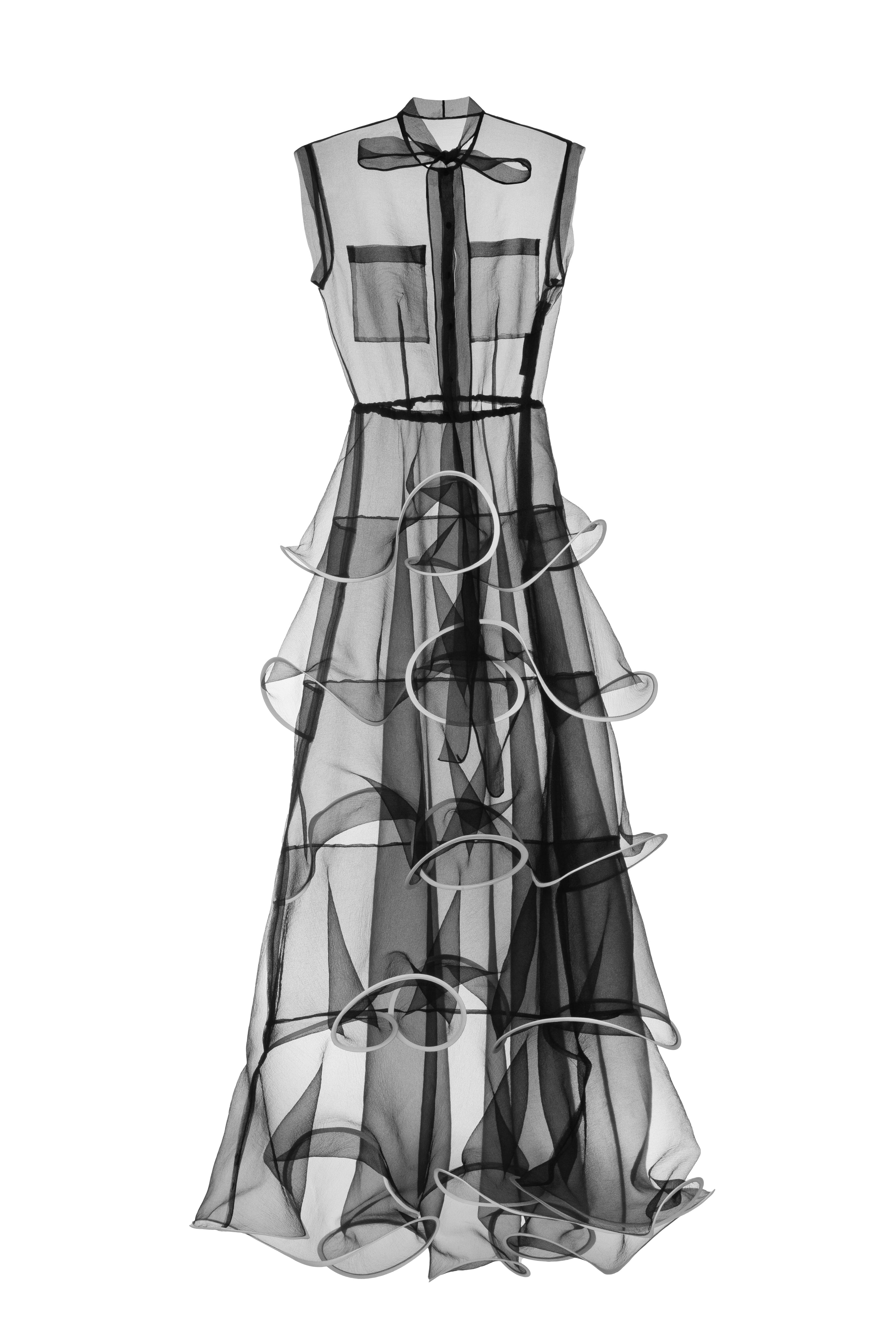 This black organza dress captures the perfect balance between minimalism and romance. Its semi-sheer design plays with light, adding a sense of weightlessness to the overall look. The tailored waistline and layered accents create a flowing, airy silhouette that moves gracefully. Every detail emphasizes its refined elegance and balanced aesthetics.