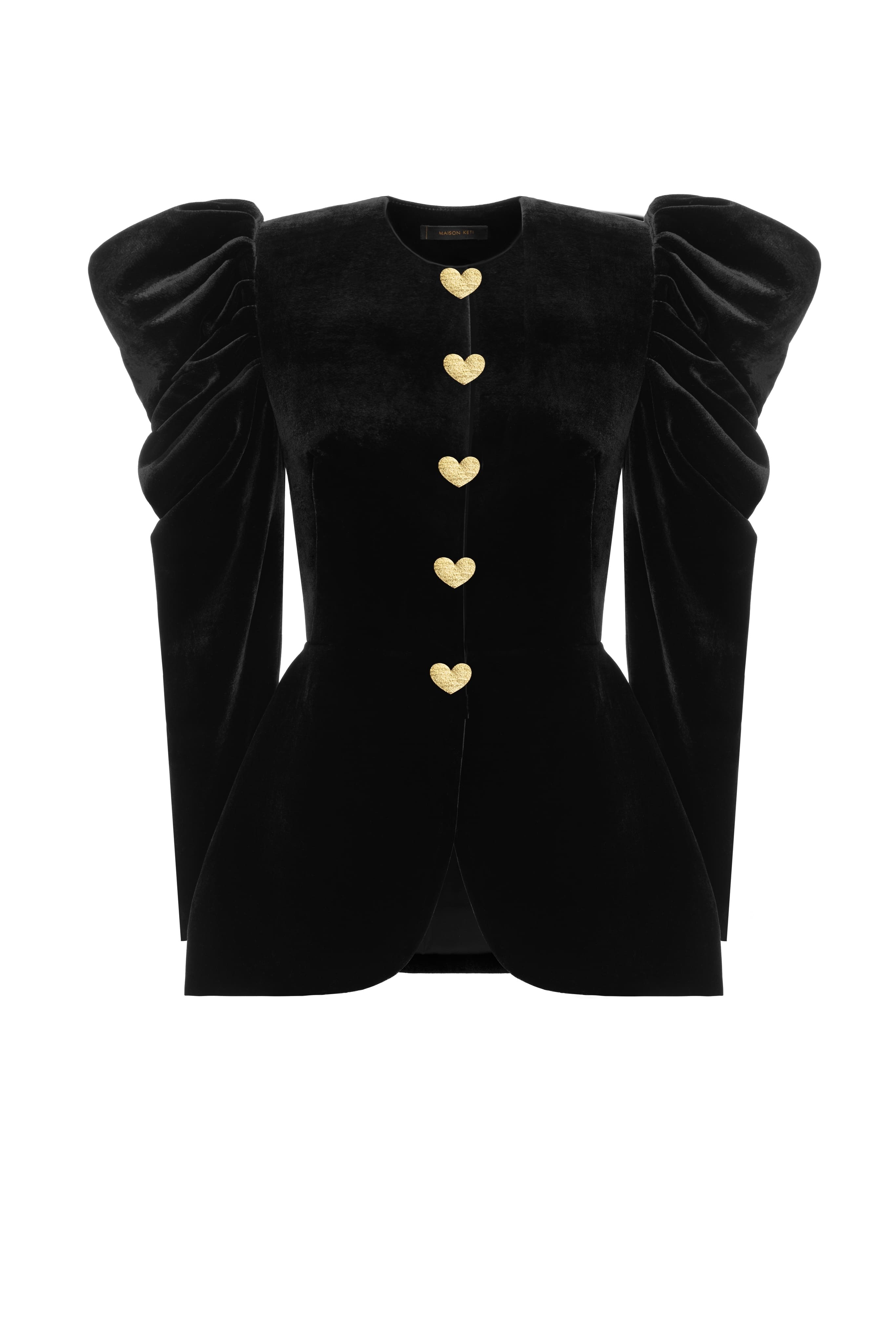Black velvet meets golden heart-shaped buttons in a silhouette that’s bold, feminine and unforgettable. The plush texture invites warmth, while the gold accents add a quiet elegance. It’s a garment that speaks volumes without ever raising its voice.
