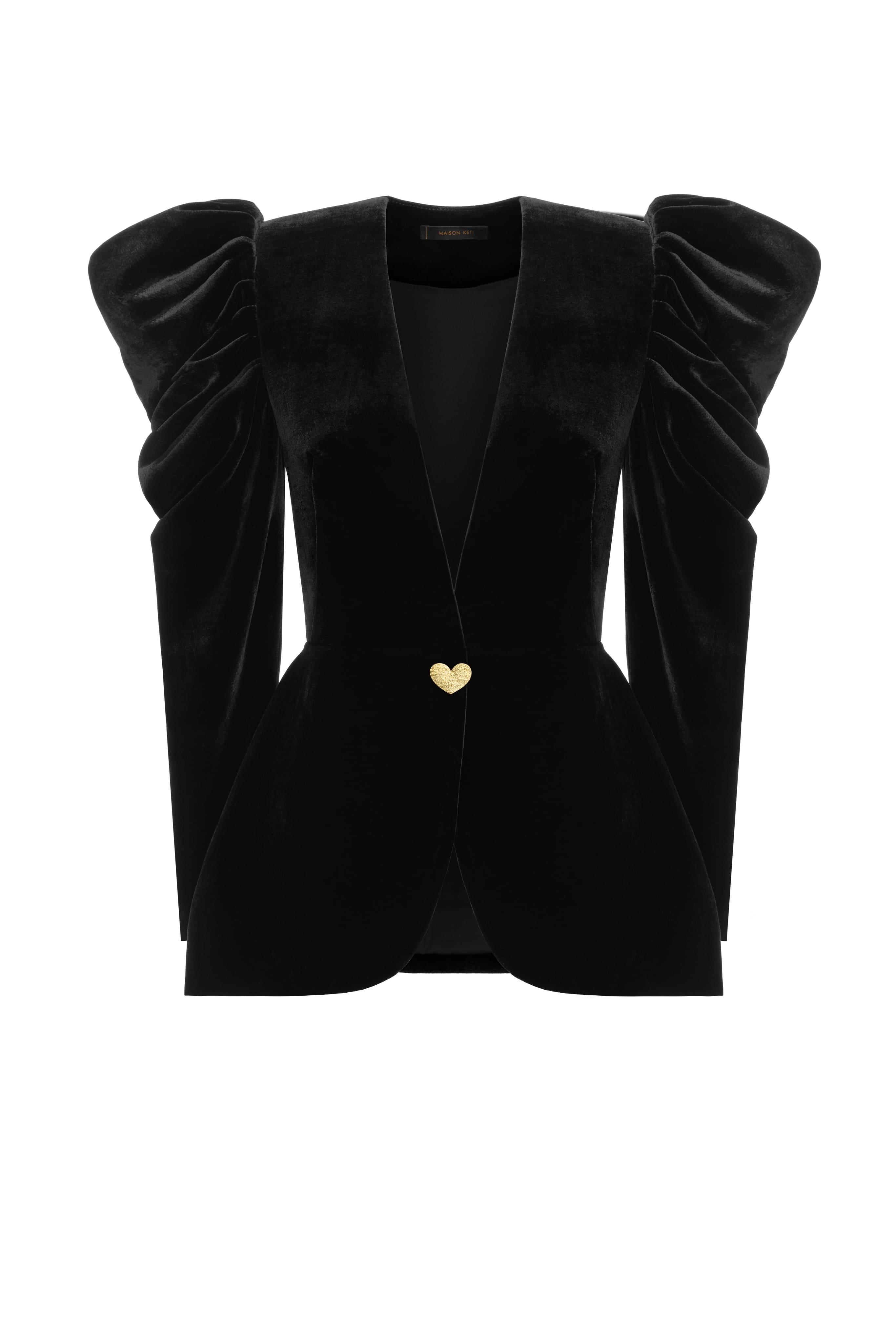 A sculpted black velvet jacket that redefines the silhouette with quiet power and feminine grace. The sharply structured shoulders evoke authority, while the cinched waist delicately contours the body, blooming softly at the hips in a subtle, tulip-like flare. Fastened by a single golden button—shaped like a heart—it whispers of promises kept and elegance remembered. The velvet catches the light like a shadow in motion, mysterious yet undeniably present.