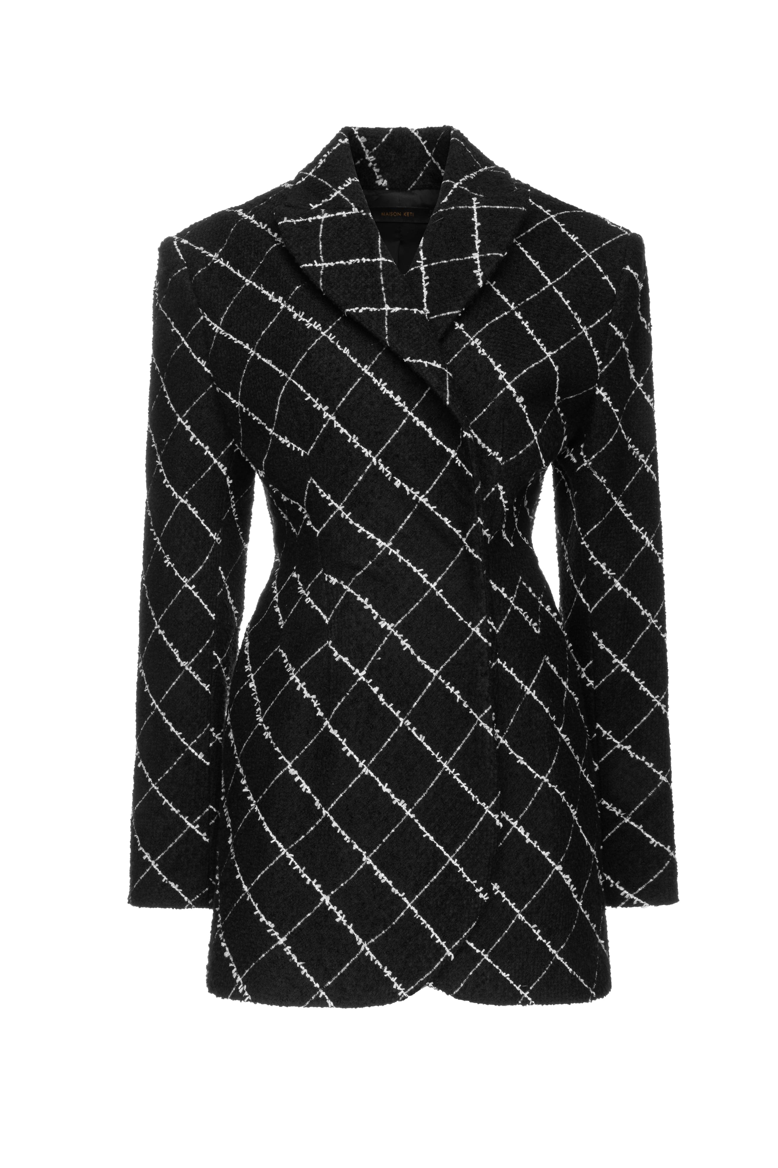 A wool blazer shaped in black and white diamond patterns a tailored silhouette that speaks of precision , purity and quiet strength, like a tribute to symmetry wrapped in elegance.