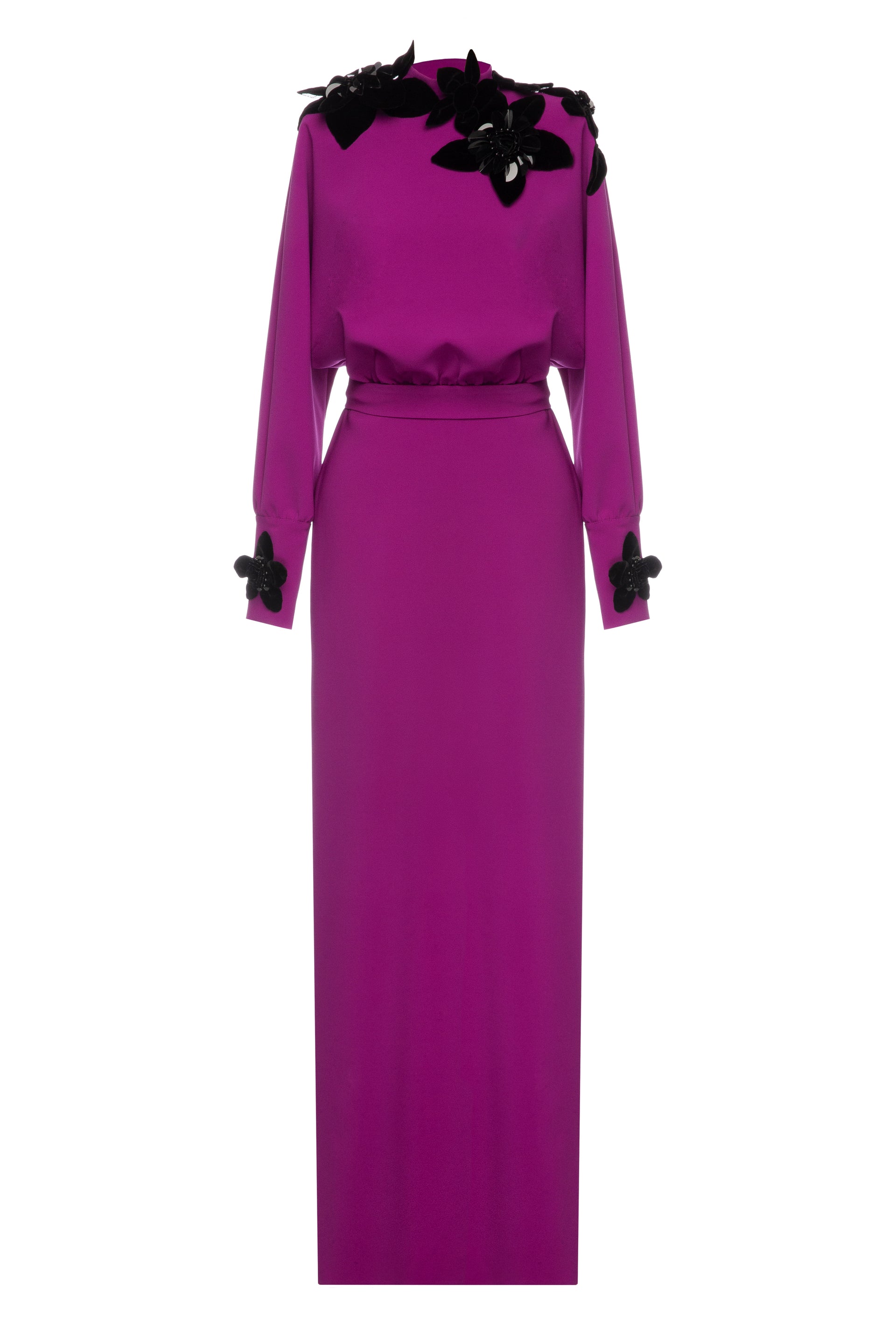 This striking, raspberry-hued dress boasts a long, straight silhouette that elegantly flows down the body. The waistline is perfectly defined with a subtle yet sophisticated seam, accentuating the figure. What truly sets this dress apart are the black velvet amaryllis flowers carefully embroidered across the fabric. The deep, rich hues of the velvet flowers contrast beautifully with vibrant raspberry color of the dress, creating a captivating visual texture.