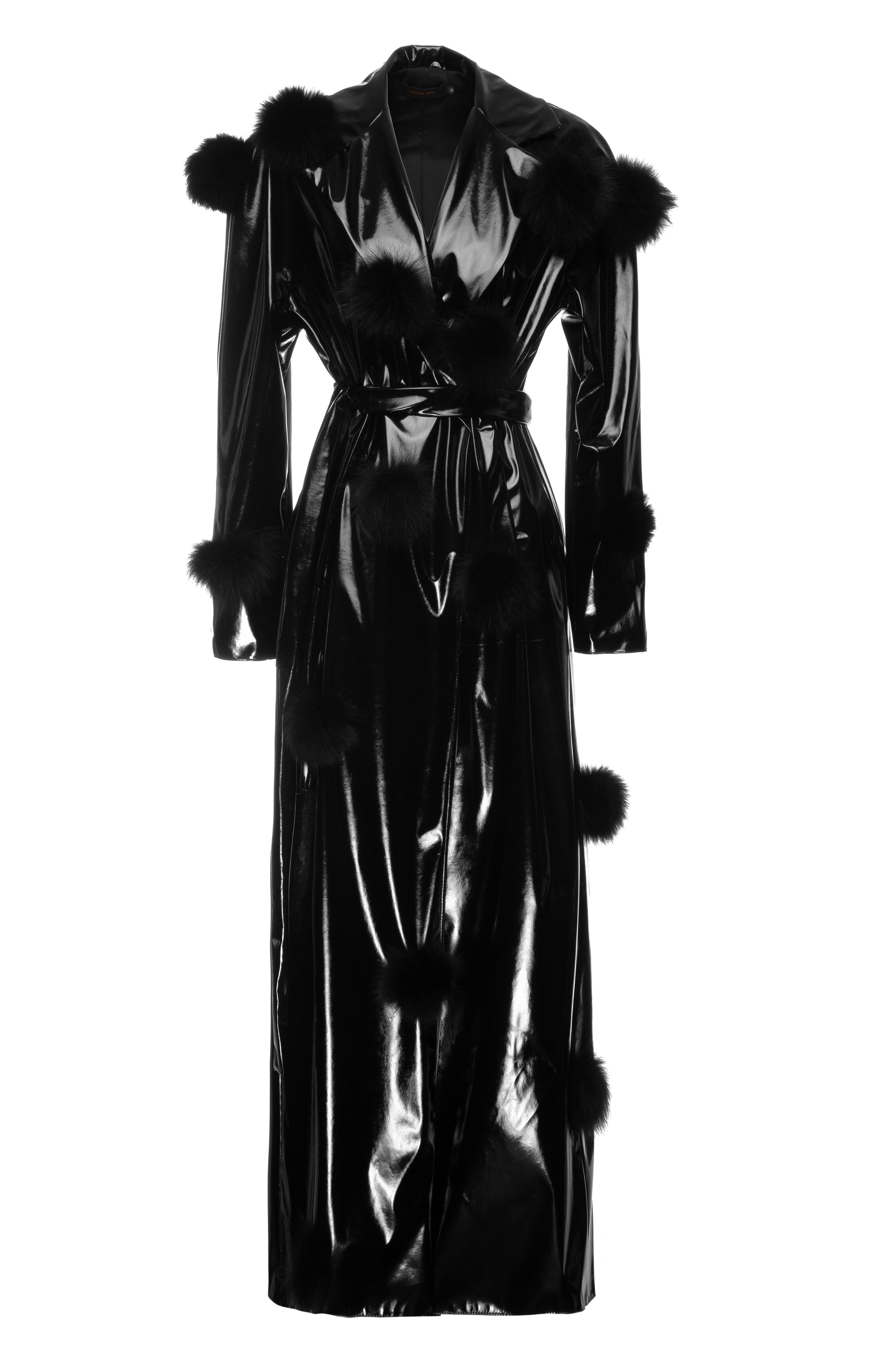 Wrap yourself in timeless elegance with our long double-breasted Trench Coat, crafted from black glossy faux leather. Designed for a all fit type, its classic silhouette is accentuated by little fur details and belt on the waist.