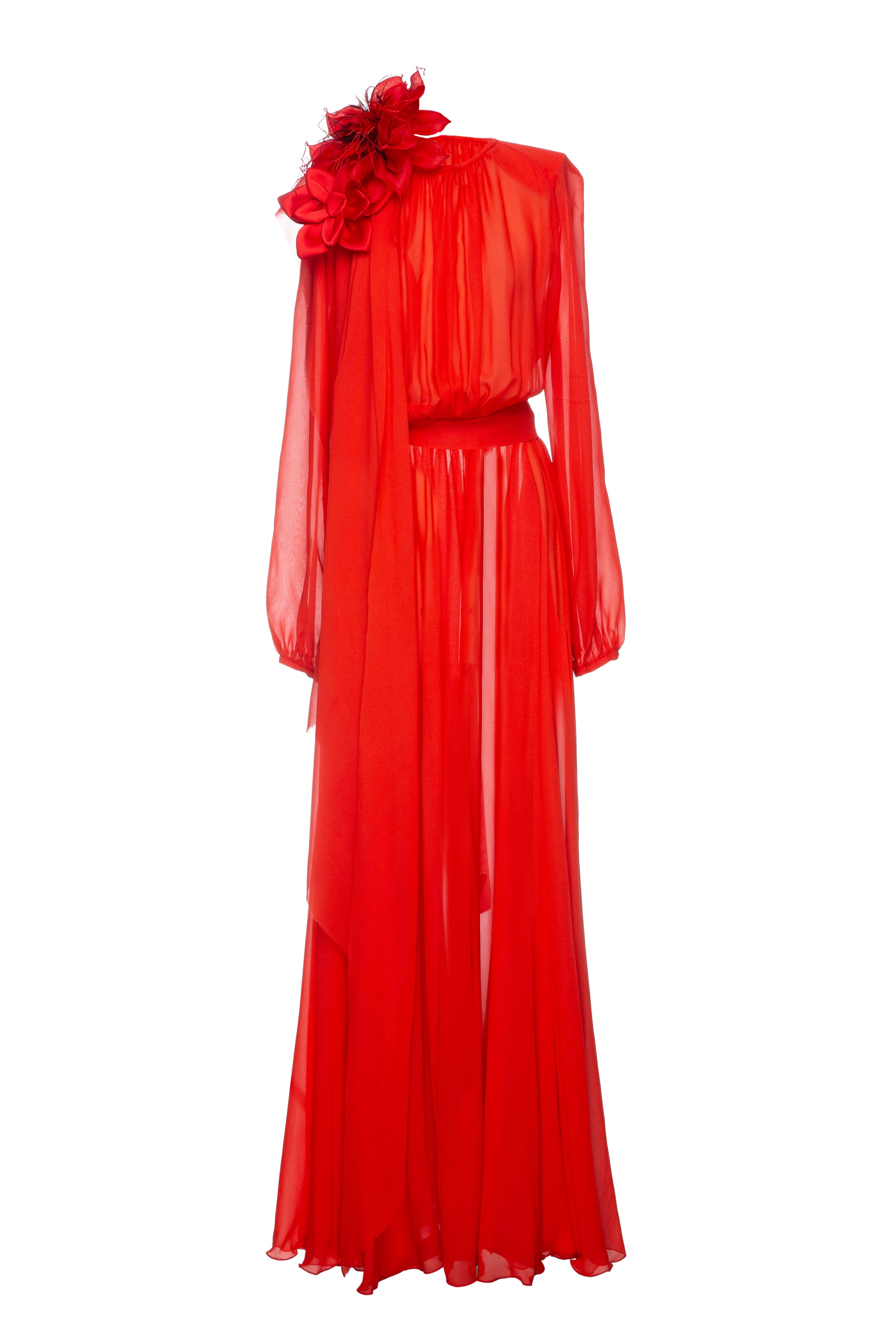 Crafted from luxurious red chiffon, the dress exudes sophistication with its flowers and cinched waist belt, for any elegant occasion. Make a statement with this exquisite dress and show your refined style.