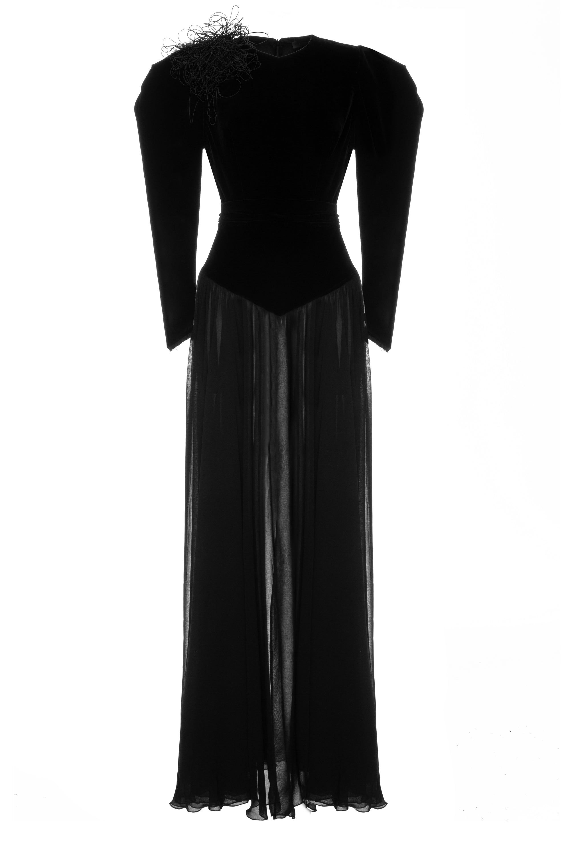 This dress is a captivating addition to any wardrobe. Its luxurious black chiffon and velvet top, is made for an elegant and timeless design. Perfect for any special occasion, this dress is an unforgettable combination of sophistication and glamour.