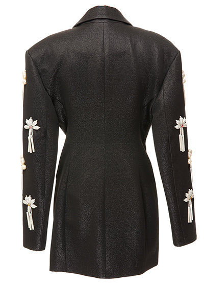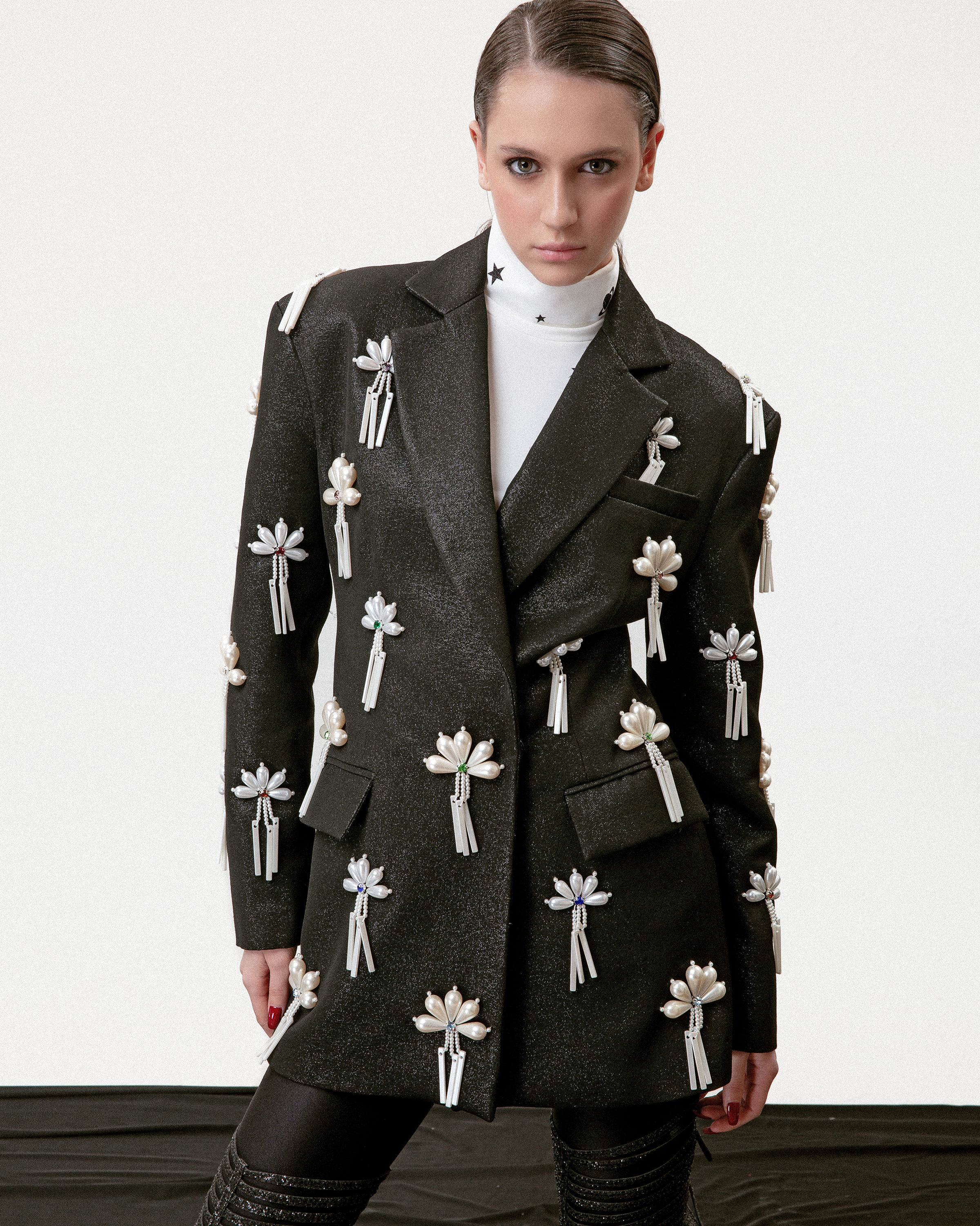 The Camelia black jacket offers a sublime combination of everyday luxury and timeless elegance, with its pearl embroidery and lightly-padded shoulders. Its versatile design makes it a wardrobe must-have, ideal for both relaxed and formal settings.