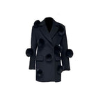 A black jacket, like beauty hidden in the shadows of the night _ adorned with black fur pom-poms, carrying both warmth and a quiet boldness, wrapped in a touch of sensational charm.