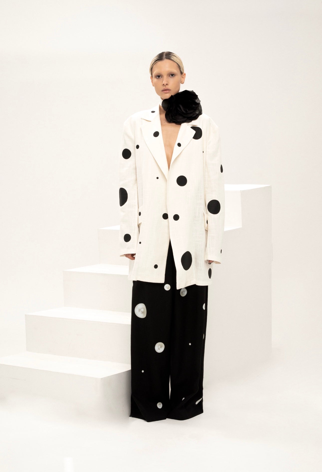 Elegance of this jacket is so eye-catching. This linen jacket printed with black balls and beautiful silhouette is both timeless and modern. Perfect choice for any occasion.