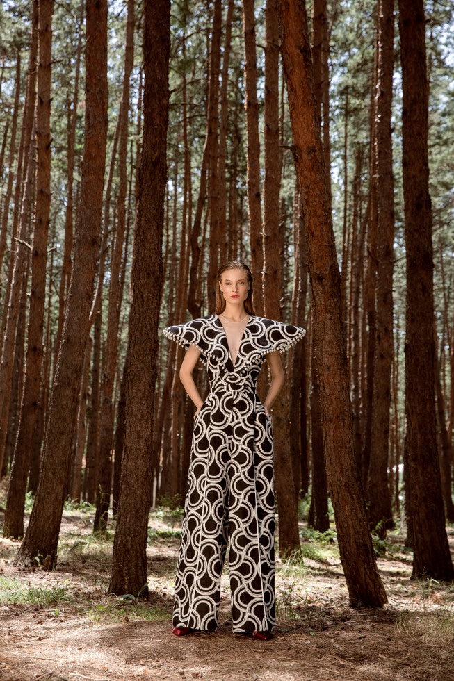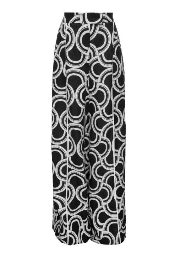 These pants cut from cotton-jacquard material. They’re designed to sit high on the waist and have wide hems.