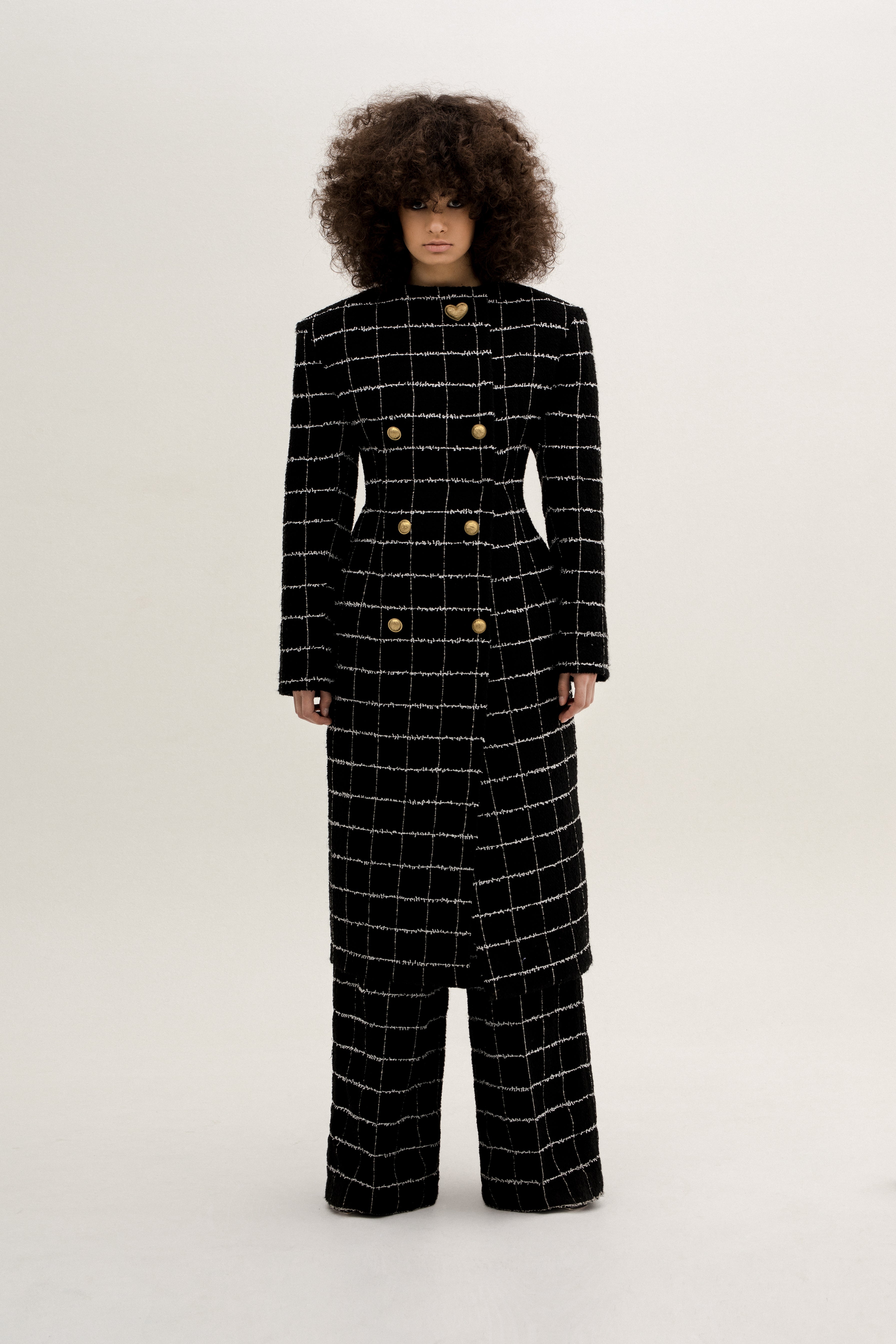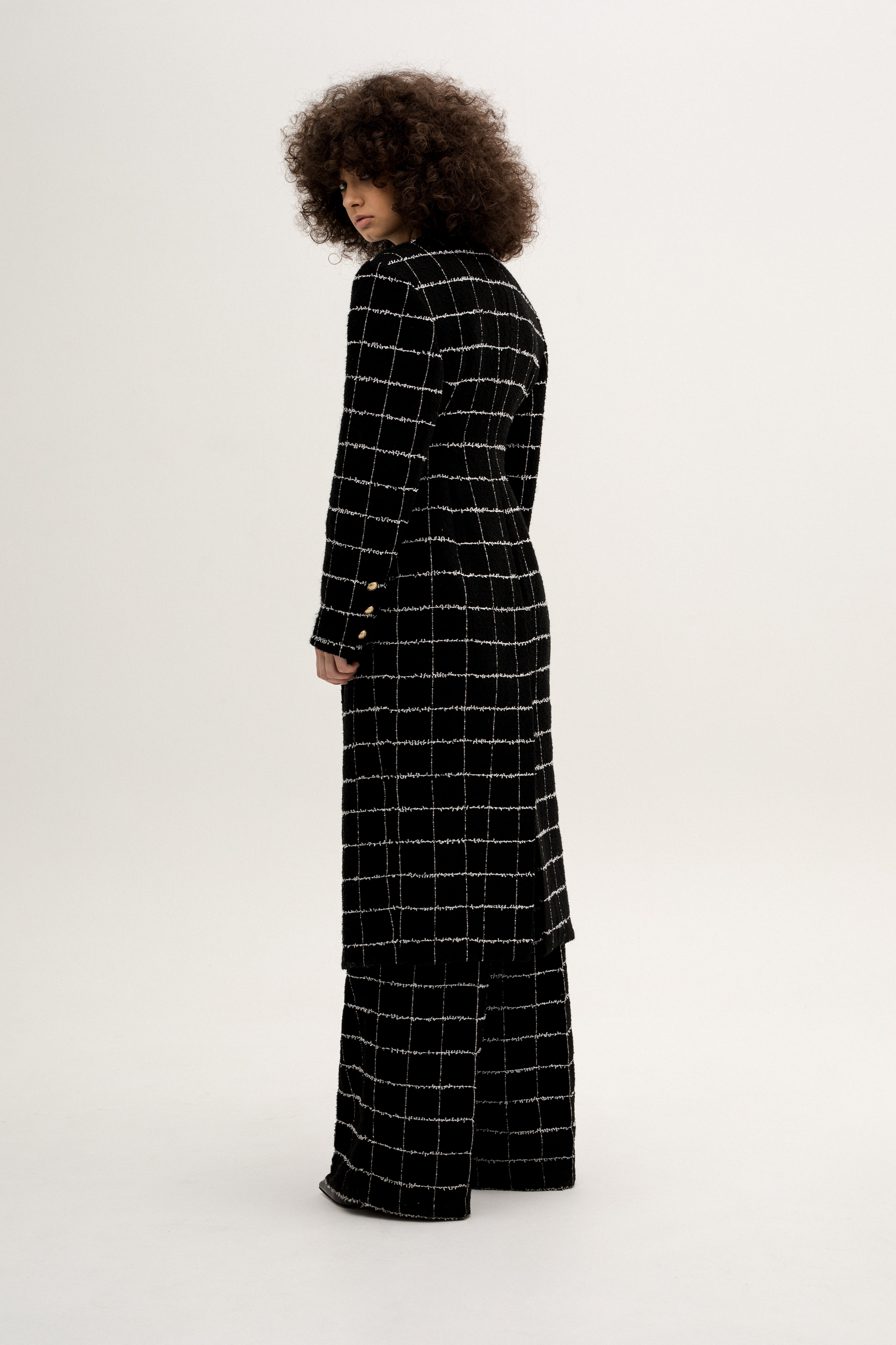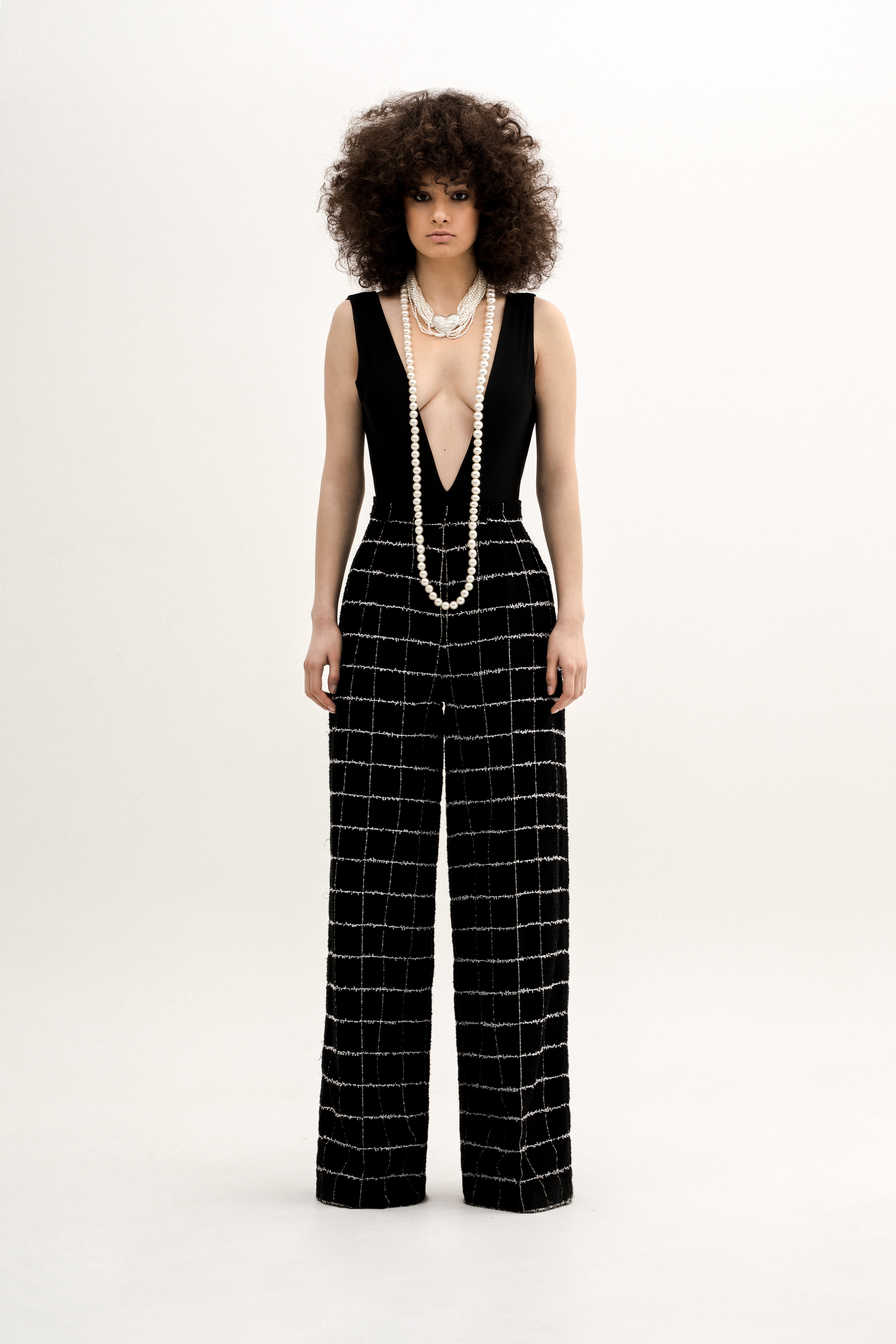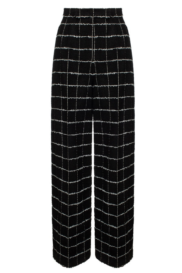 Experience luxury with these timeless black jacquard pants. Crafted with a chic white criss-cross line, these trousers will be sure to make a statement and enhance your wardrobe. Rich and sophisticated, these pants are perfect for any occasion.