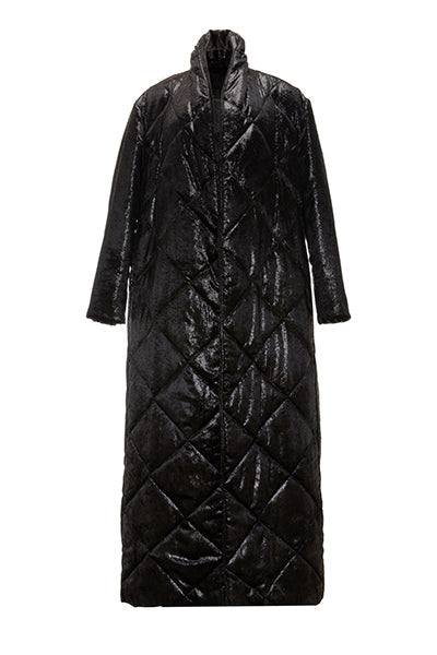 A long, padded black velvet jacket that perfectly combines style and comfort. It’s soft and glossy velvet texture adds a touch of uniqueness and elegance, while the padded lining ensures warmth and coziness in colder weather. The oversized design and extended length make it a chic and practical choice for your everyday wardrobe.
