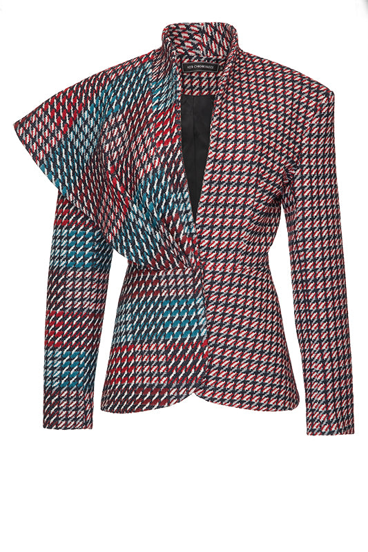 A tailored blazer crafted from two types of plaid fabric, featuring a bold and dramatic wing-like collar on one shoulder. The cinched waist enhances the silhouette, combining classic sophistication with avant-garde design elements for a striking and unique appearance.