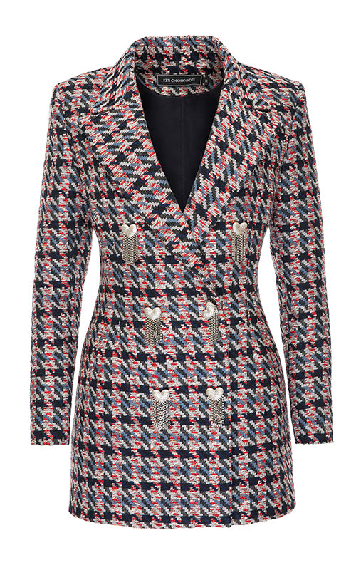 A refined and striking two-button blazer in silver, featuring intricate chain detailing on the buttons. The unique design blends sophistication with a bold twist, offering a chic and commanding look. Ideal for making a statement while maintaining a sharp, professional edge.