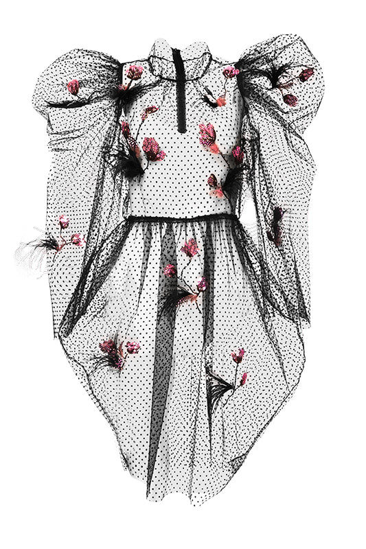 A black tulle dress with polka dots, featuring voluminous sleeves and a bottle-shaped silhouette below the waist. Intricate floral embroidery crafted with raspberry-colored beads adorns the fabric, further enhanced by delicate black feather accents. This design blends romantic elegance with avant-garde artistry.