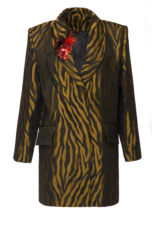A black tailored blazer featuring a striking gold tiger-print pattern and accented with a bold red decoration. The structured design exudes a dramatic and fearless aesthetic, perfect for formal events or statement-making looks.