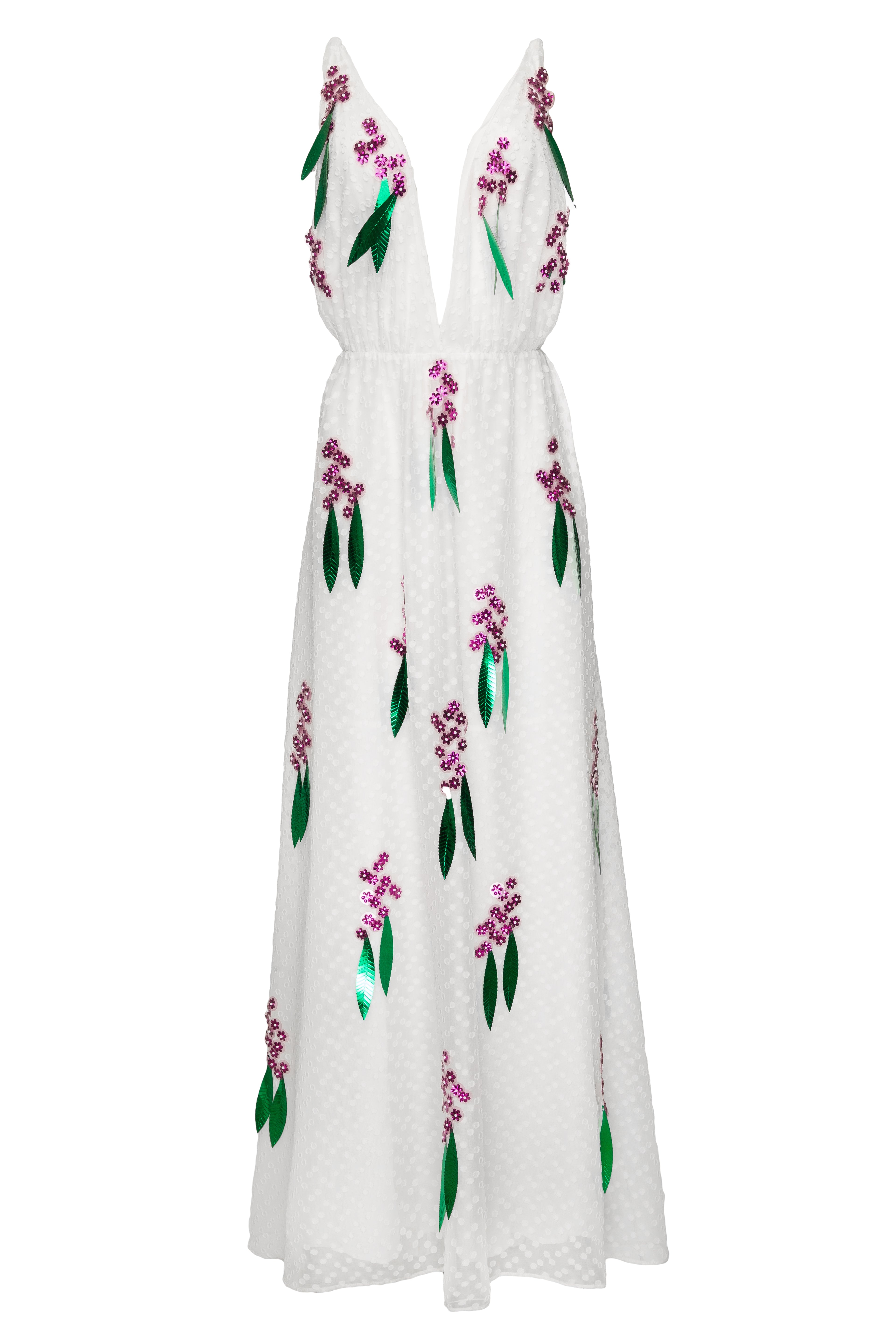 A stunning long chiffon dress adorned with embroidered flowers in shades raspberry with green leaves, featuring a fully open back, the dress exudes a lightweight and romantic style, perfect for summer hot days.