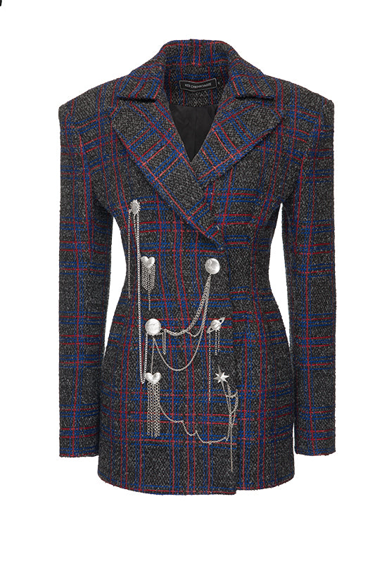 A gray double-breasted blazer adorned with vibrant multicolor stripes and silver accents. Featuring metallic buttons and delicate chain details, the design blends classic tailoring with a bold, modern twist. Its structured silhouette and colorful elements make it a standout piece for both formal and avant-garde looks.
