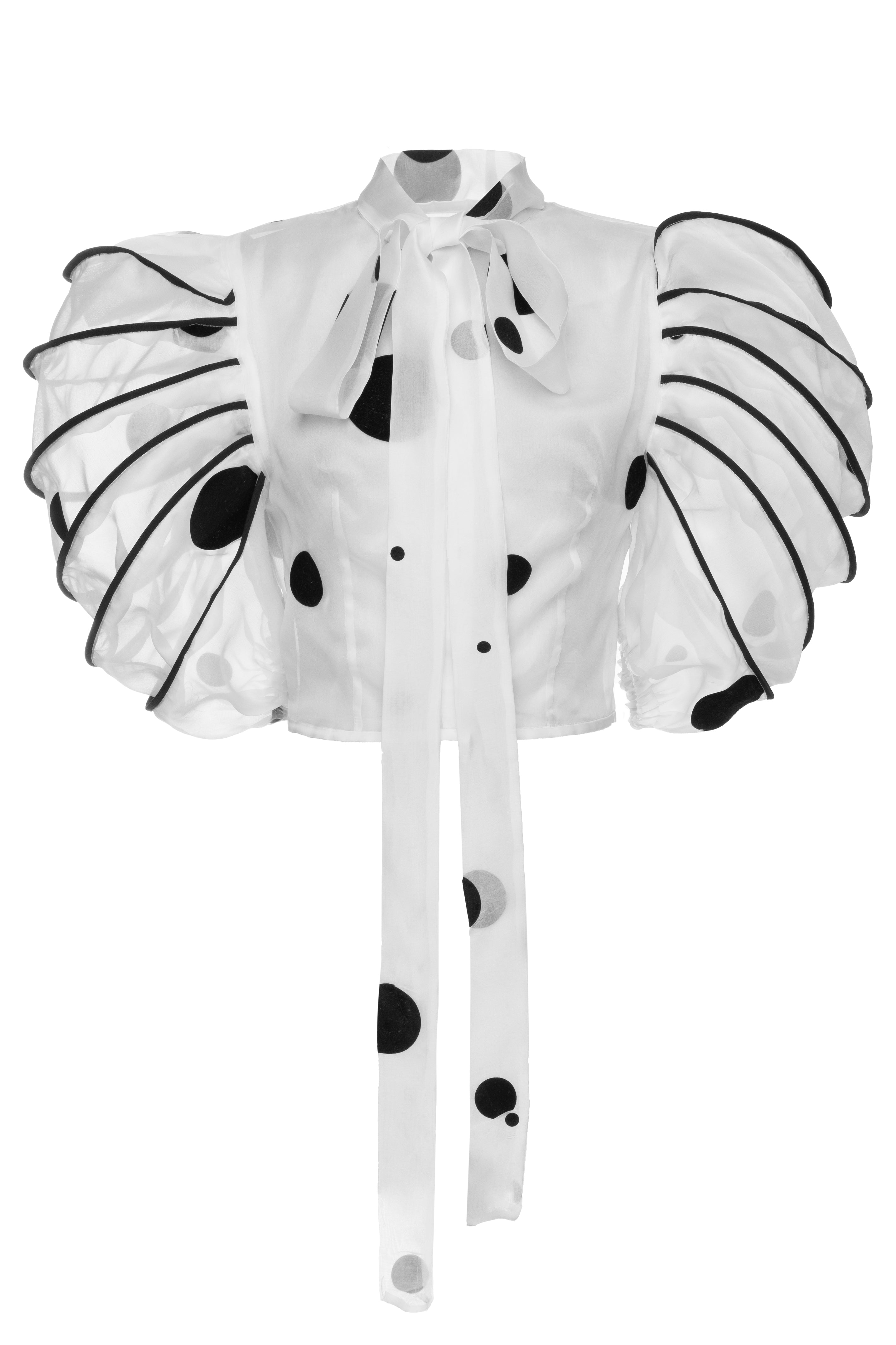 This extravagant white blouse combines beauty and expressiveness in a unique blend. The polka-dotted texture of the airy fabric adds a sense of modern charm, while the bold black outlines accentuate the design. The sleeves, with their distinctive wing-like shape, create an additional flair of movement and lightness. Perfect for special occasions or a contemporary photoshoot, this piece stands out with its striking and one-of-a-kind details.