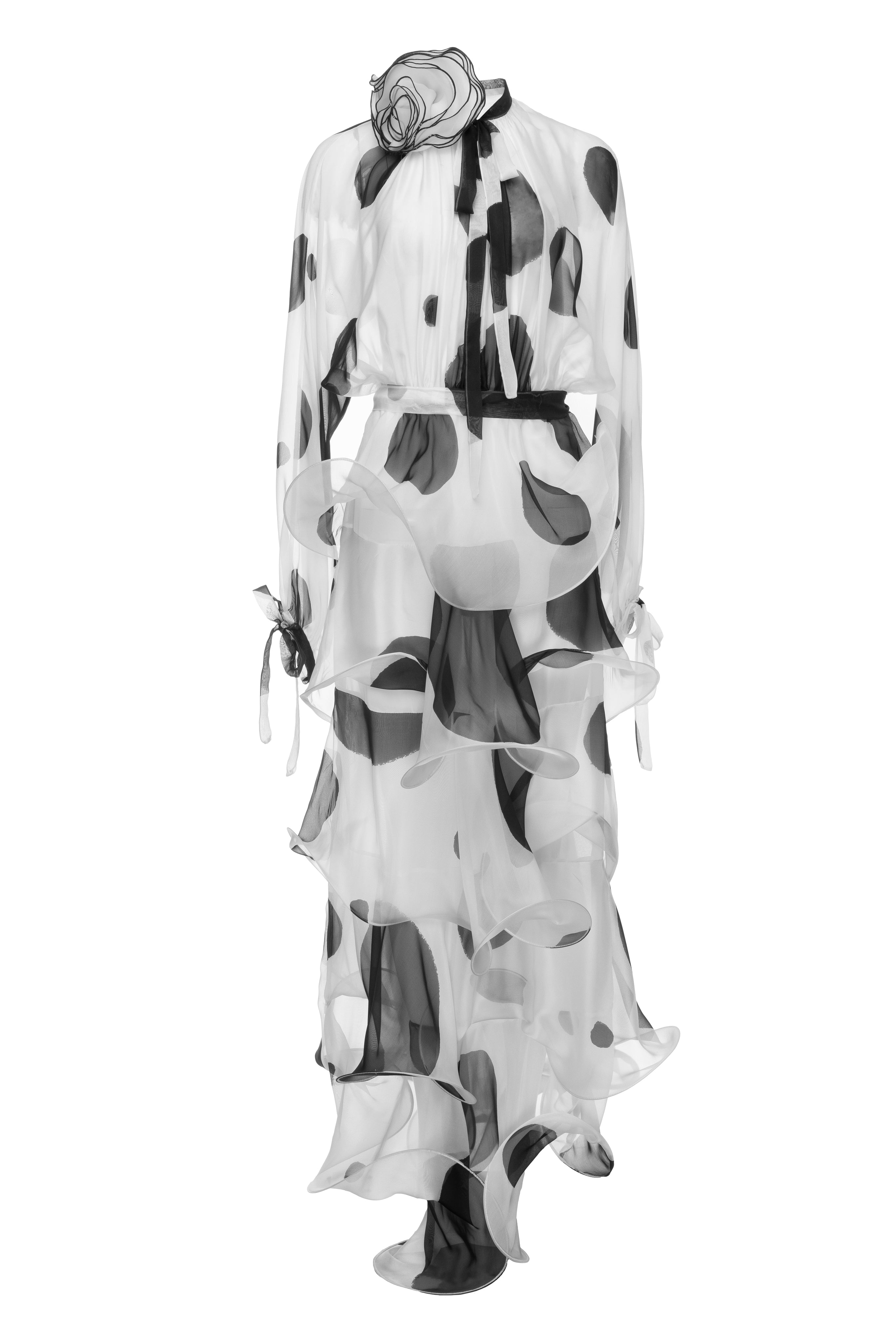 This unique organza dress combines creative and contemporary design. The delicate transparency harmonizes with the vibrant floral details, creating a dynamic interplay of light and movement. Its multi-layered structure and dimensional shape add sophistication and a touch of exclusivity to the piece. Perfect for those seeking exceptional elegance and bold fashion experiments.