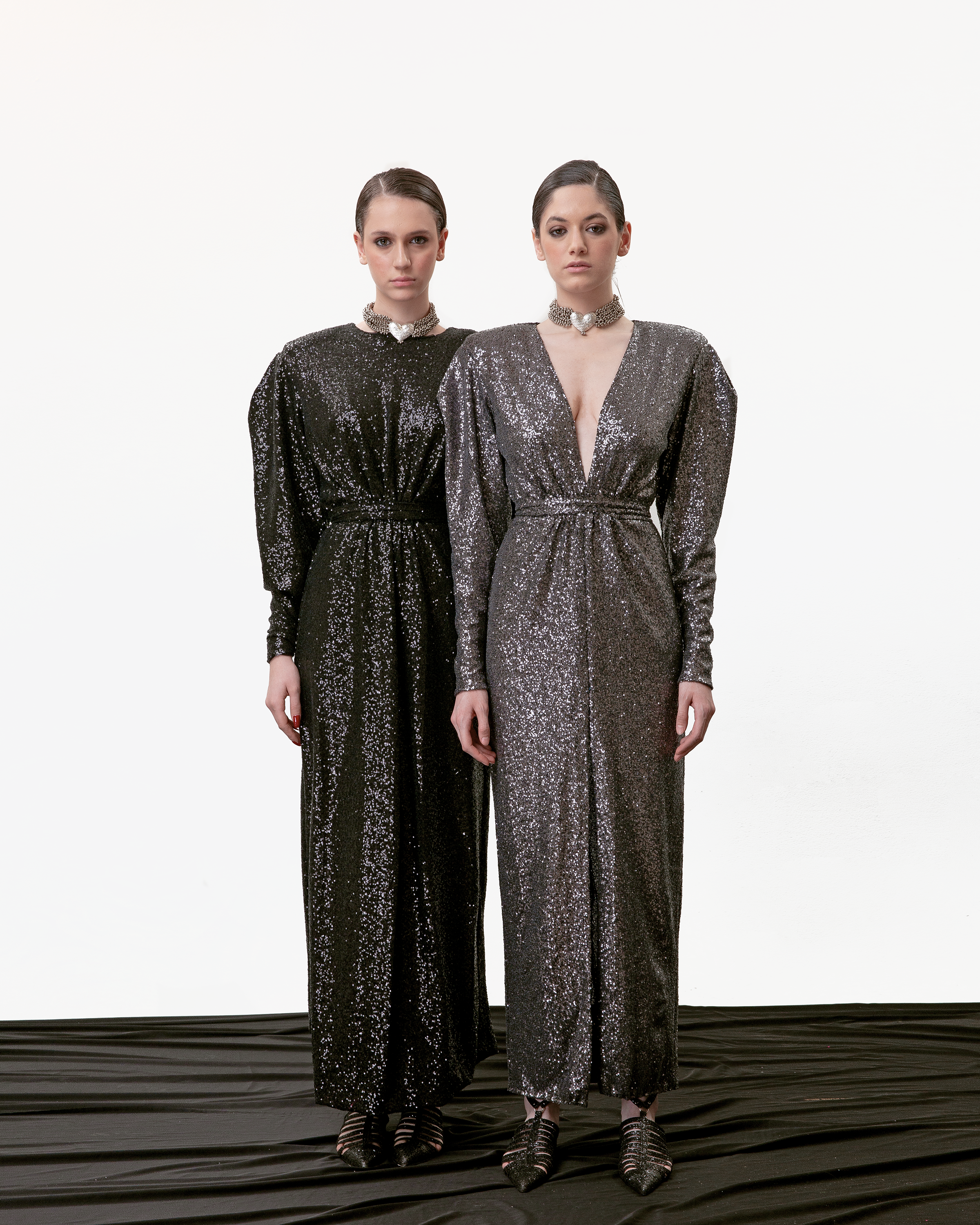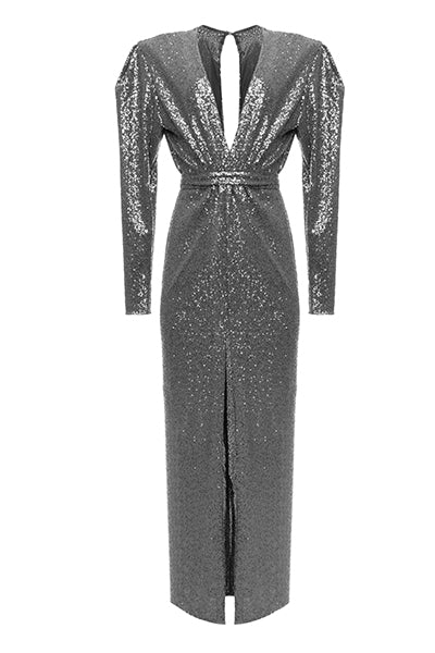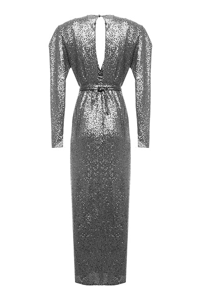 This Anemone dress is crafted with a luxurious silver chishua, with a sophisticated V-neck and a cut out back. It's the perfect combination of sexy and classy, allowing you to make a lasting impression. The elegant texture of this garment will surely add a touch of opulence to your wardrobe.