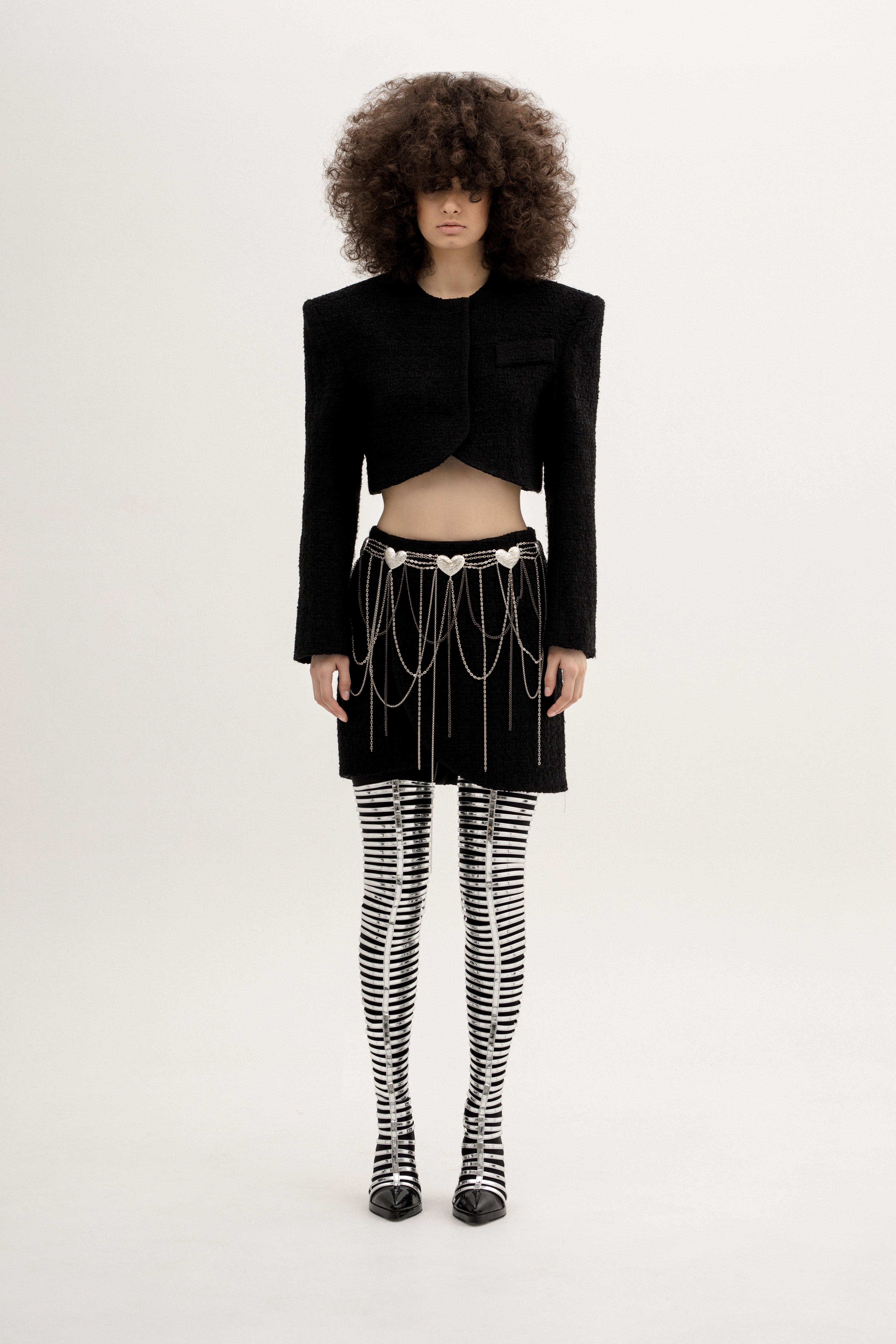 Experience sophisticated elegance with this premium short black blazer from jacquard. Crafted with luxurious jacquard, this cropped blazer epitomizes timeless sophistication. Enhance your outfit and elevate your look with this exclusive piece, perfect for formal occasions.