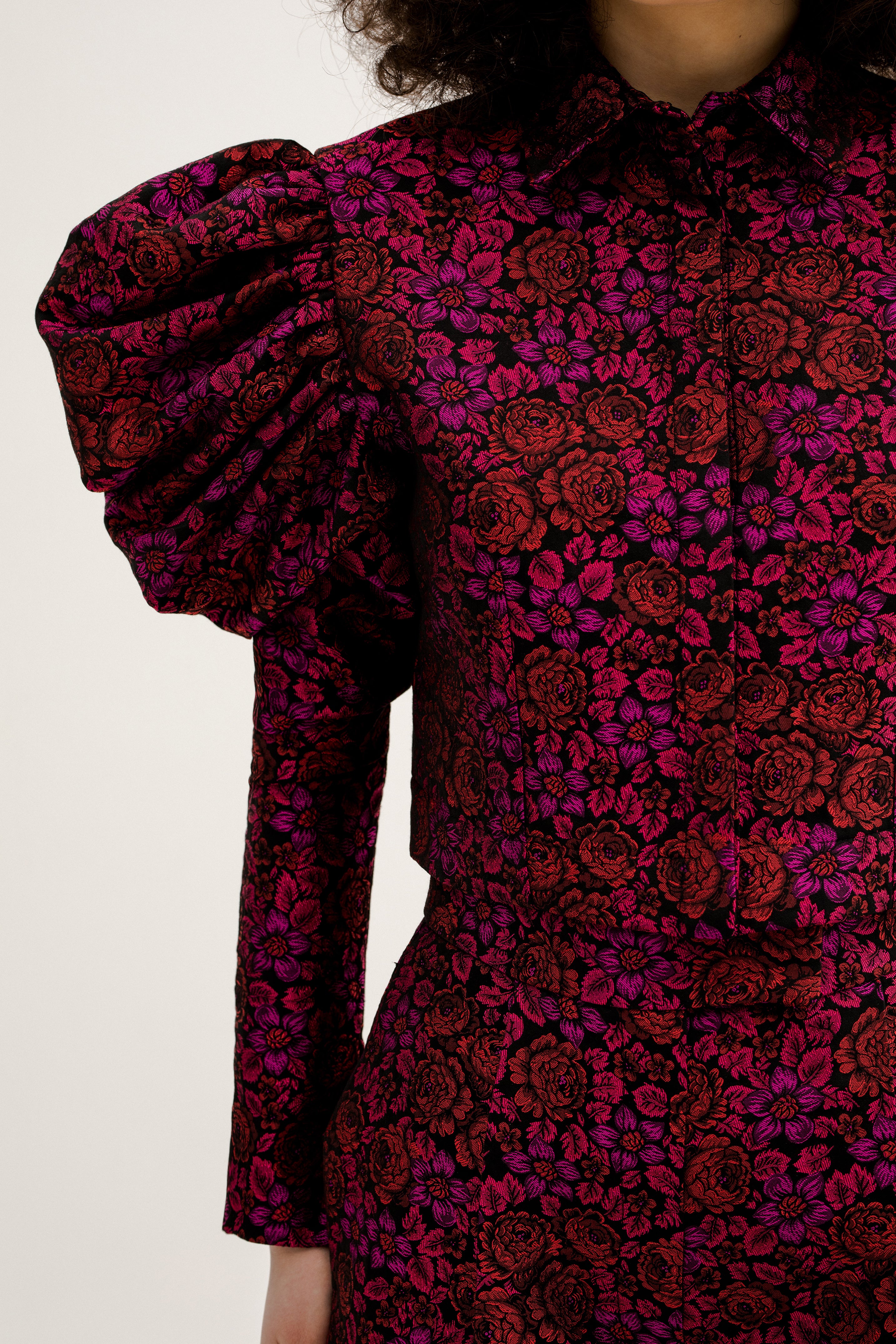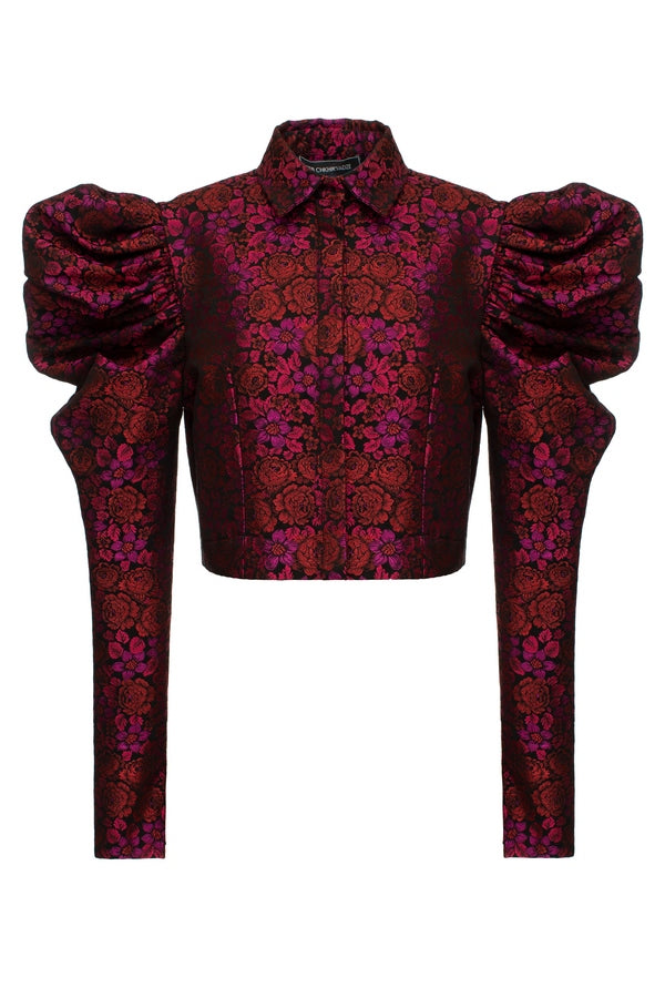 Introducing a classic yet daring look with this short silk blazer adorned with elegant floral patterns. Featuring delicately padded shoulders, this blazer is designed to accentuate your figure while evoking sophistication, luxury, and timelessness.